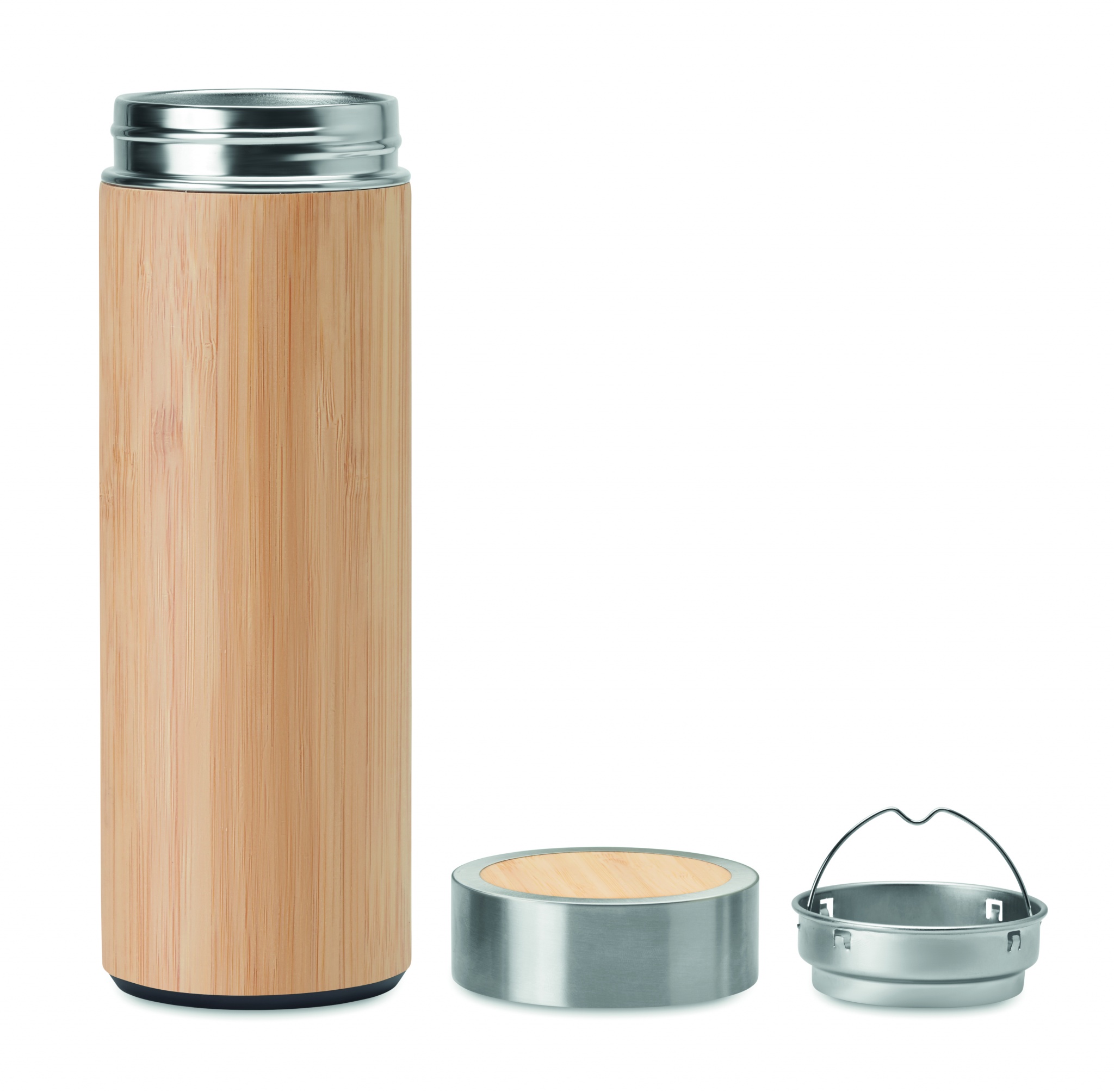 Termos mugg i rostfritt stål med dubbla väggar som gör att värme eller kyla håller bättre. Bambu på utsidan och te sil inuti. Volym: 400ml.