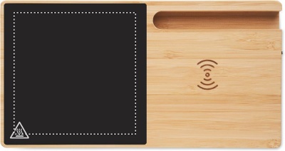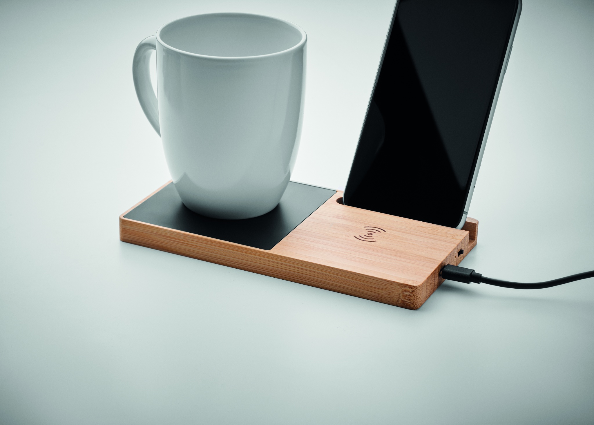 Trådlös laddare i bambu med mugghållare och telefonställ. Anslut enheten till din dator, placera din smartphone på den och låt den laddas. Utgång: DC 9V/1,67A (15W). Kompatibel med senaste Androids, iPhone® 12, X och nyare.