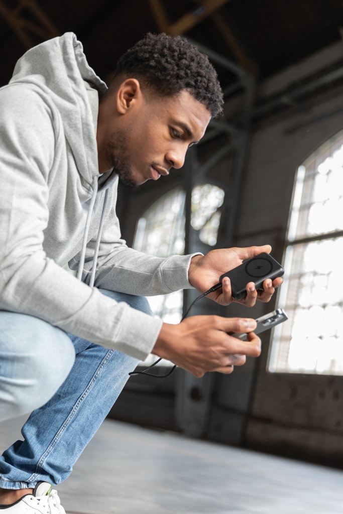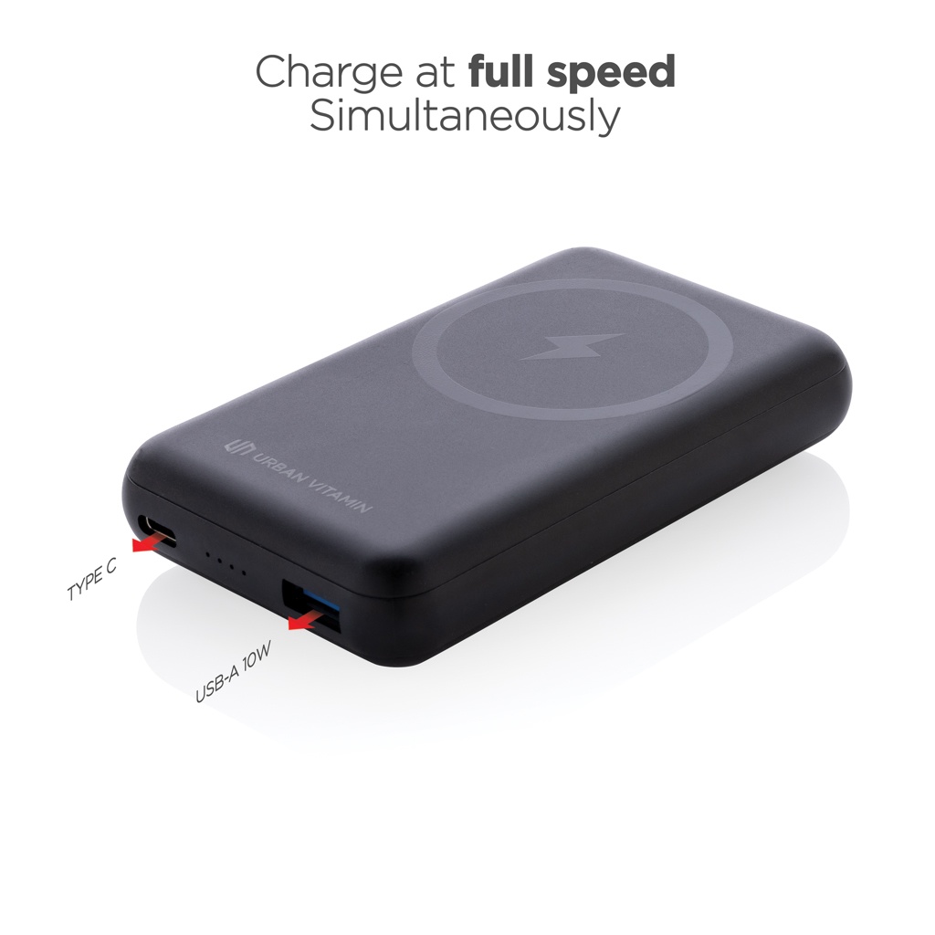 Ladda din telefon upp till 2.5 gånger med denna snabbladdande powerbank. Powerbanken har en smärt och kompakt design och en integrerad snabb 10W trådlös magnetisk laddare. Med ett mångsidigt inbyggt vikbart stöd som håller din telefon upprätt för en bekväm vinkel. Tack vare den ultrasnabba type C PD porten laddas powerbanken snabbt upp. Att ladda din mobil upp till 50% tar bara 30 minuter. Powerbanken har ett långvarigt A-graderat 10.000 mAh batteri. Den dubbla outputen A och type C möjliggör laddning av två enheter samtidigt. Tillverkad av RCS (Recycled Claim Standard) certifierad återvunnen ABS. Totalt återvunnet innehåll: 16% baserat på total produktvikt. RCS certifiering säkerställer en helt certifierad leveranskedja av de återvunna materialen. Urban Vitamin produkter är PVC-fria och levereras i en plastreducerad förpackning. USB :5V 3.0A Type C : 5V 3.0A,9V 2.22A, 12V 1.5A .