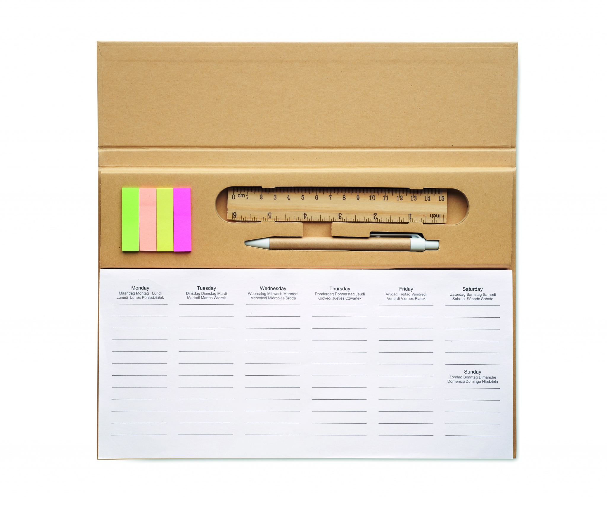 Veckoplanerare för skrivbordet (mån-sön) med omslag i kraftpapper, penna i kartong med blått bläck, trälinjal och anteckningsblock med självhäftande lappar.